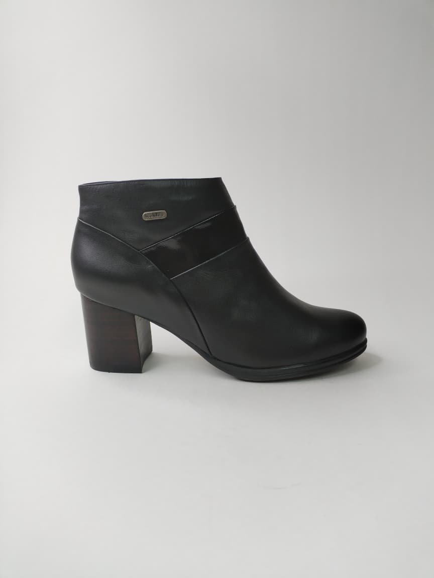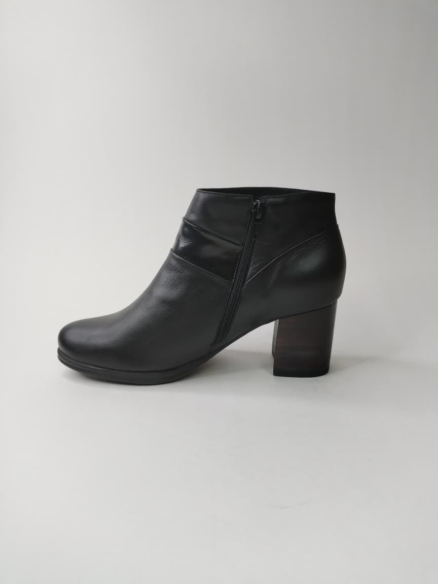 Su taco medio cuadrado de madera oscura (6,5 cm) ofrece estabilidad y un andar cómodo, ideal para el uso diario. El cierre lateral facilita el calce, mientras que su forro textil suave y plantilla de cuero acolchado brindan confort prolongado. Perfecto para looks urbanos elegantes, atuendos formales o casuales sofisticados.